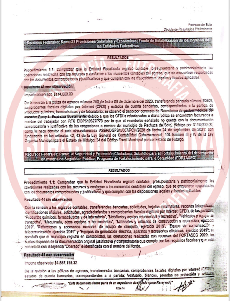 Líneas más abajo, en el apartado denominado Resultado 43 con observación, se señala que la cantidad de dinero observada es por un monto de 114,000 pesos.